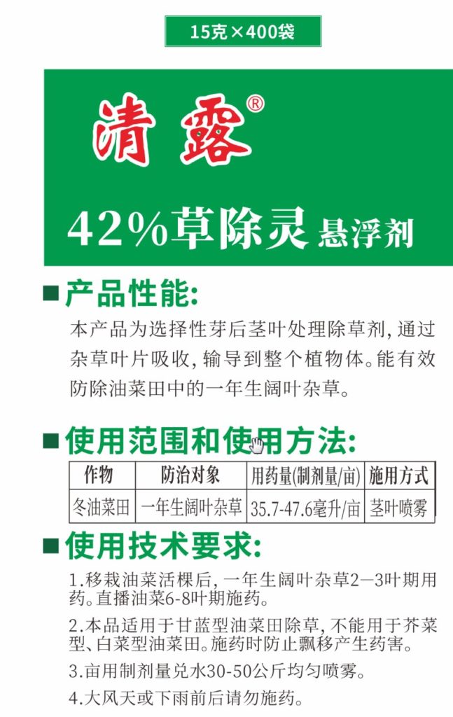 [使用技術(shù)要求]1.移栽油菜活棵后,一年生闊葉雜草2-3葉期用藥。直播油菜6-8葉期施藥。2.本品適用于甘藍(lán)型油菜田除草,不能用于芥菜型、白菜型油菜田。施藥時(shí)防止飄移產(chǎn)生藥害。3.畝用制劑量兌水30—50公斤均勻噴霧。4.大風(fēng)天或下雨前后請勿施藥。5.油菜每個(gè)生產(chǎn)周期最多使用1次。